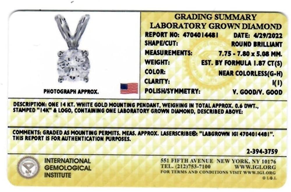 Certified 1.87Ct Diamond Solitaire Pendant White Gold Necklace Lab Grown (GH/I1)